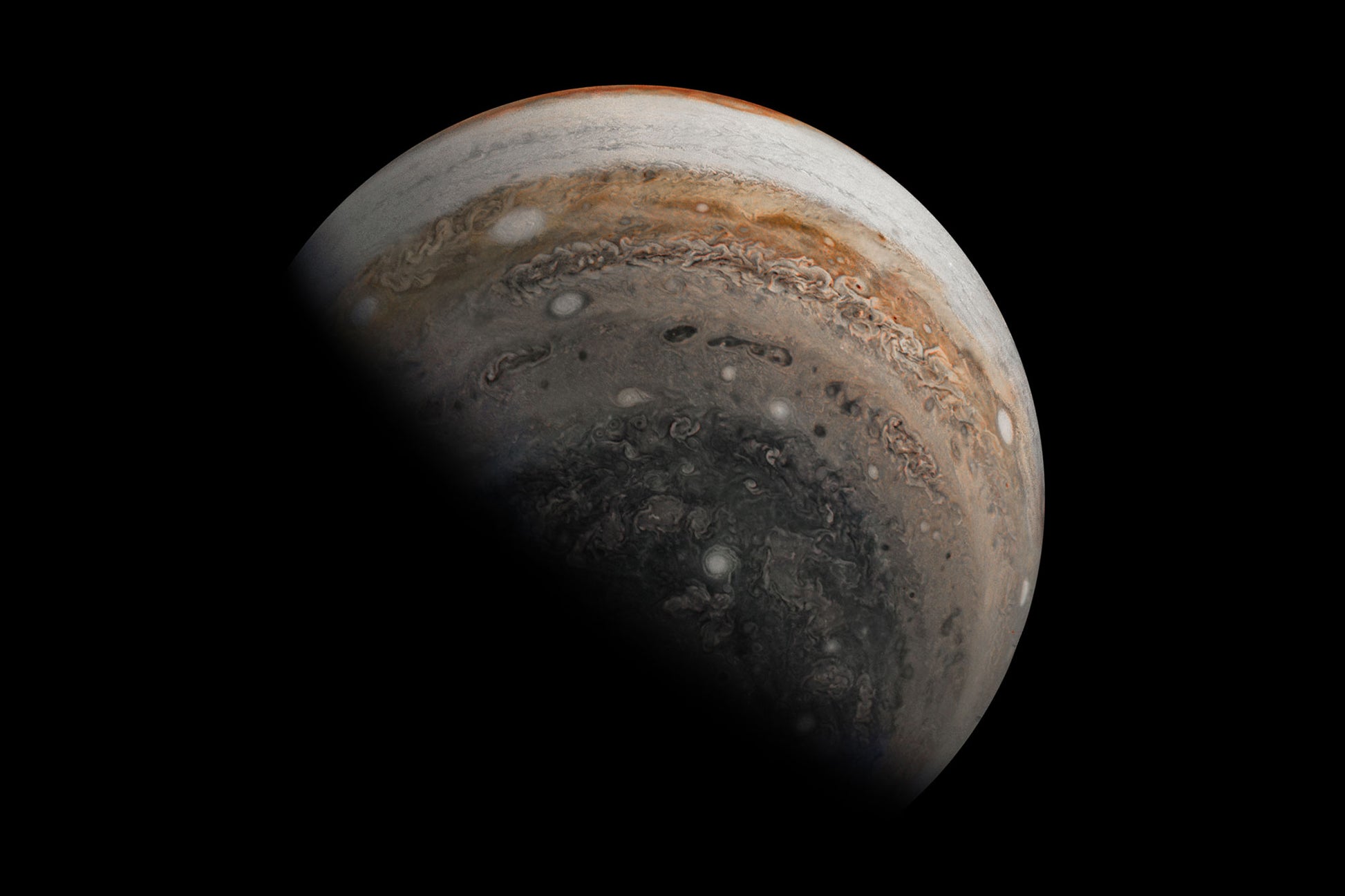 Kurz nach seinem nahen Vorbeiflug an Jupiter hat die Juno-Raumsonde der NASA diesen beeindruckenden Blick auf die südliche Hemisphäre von Jupiter aufgenommen, als die Raumsonde von dem Riesenplaneten wegraste. Dieses Bild fängt massive Wirbelstürme in der Nähe von Jupiters Südpol sowie die chaotischen Wolken der gefalteten Filamentregion ein – dem turbulenten Bereich zwischen dem orangefarbenen Band und der bräunlichen Polarregion.
